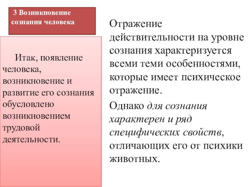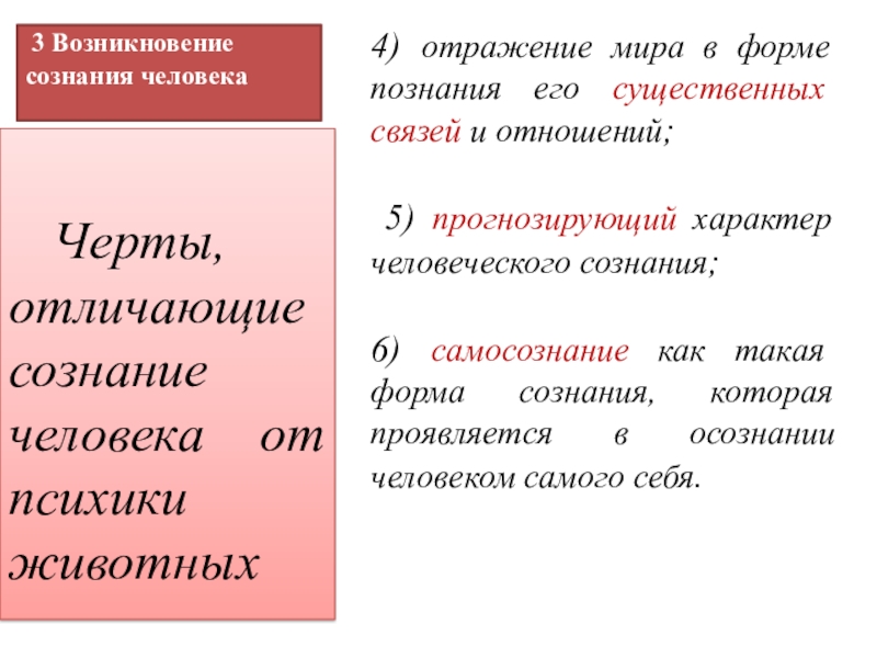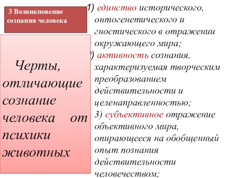 Однако для сознания характерен и ряд специфических свойств, отличающих его от психики животных.