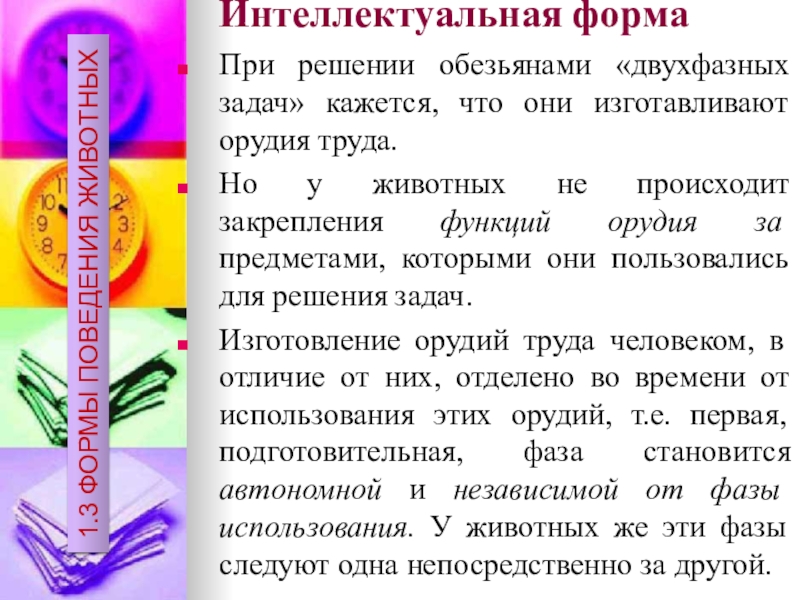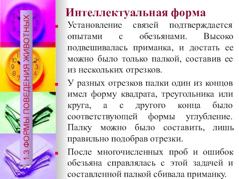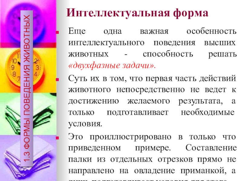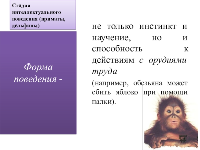 Интеллектуальное поведение - поведение животных, характеризующееся «изобретением» ими новых способов решения задач, использованием внешних предметов как орудий, обходом препятствий, решением двухфазных задач, явлением инсайта и т.п.