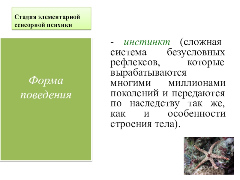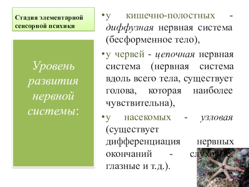 сетевидная или ганглиозная нервная система, отражение отдельных свойств предметов, инстинктивные формы поведения.