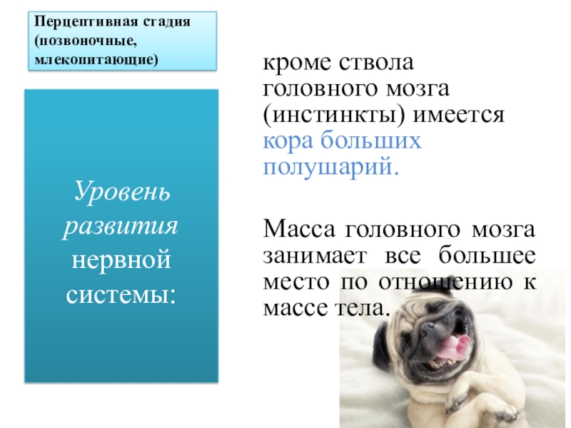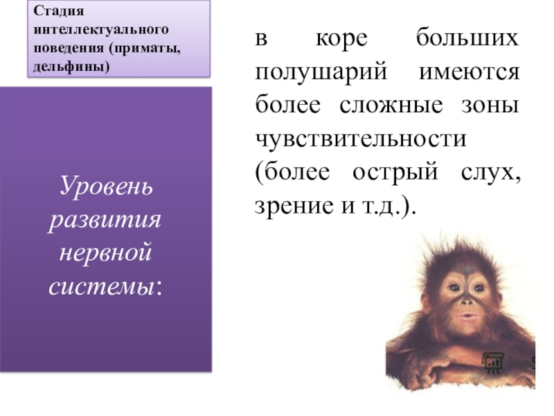 кора больших полушарий, отражение отношений между предметами, появление игровых фор поведения, медленное формирование прижизненных навыков.