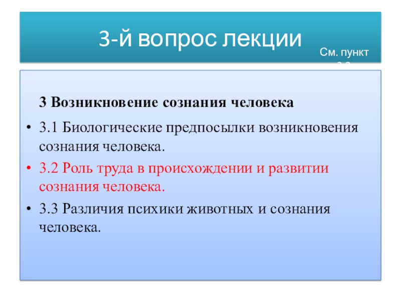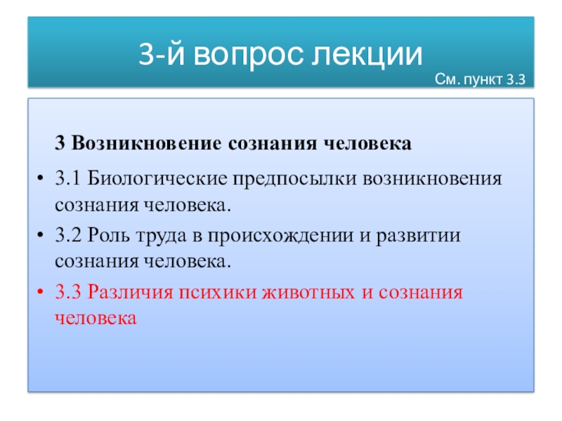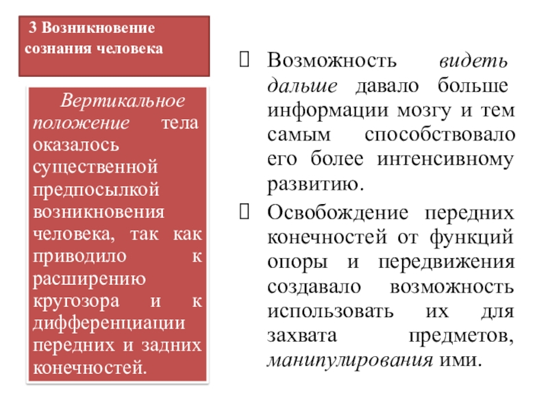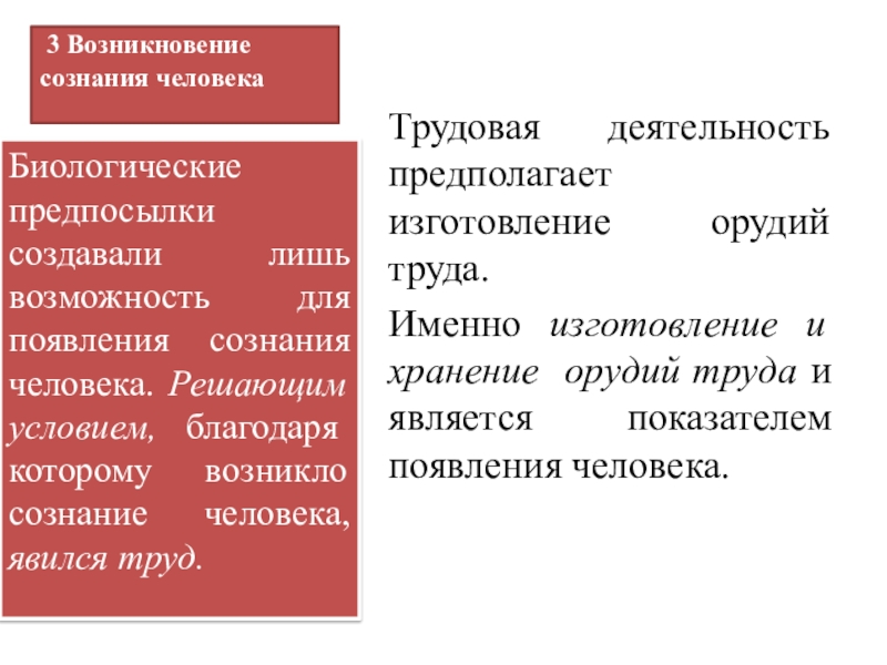 Биологические предпосылки создавали лишь возможность для появления сознания человека. Решающим условием, благодаря которому возникло сознание человека, явился труд.