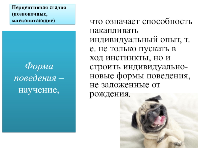 В процессе эволюции сам тип приспособления животных к окружающей среде радикально меняется: врожденные программы поведения, занимающие ведущее место у насекомых отступают на высших этапах эволюции на второй план, и у позвоночных, особенно у млекопитающих, поведение становится уже совершенно по другому принципу.