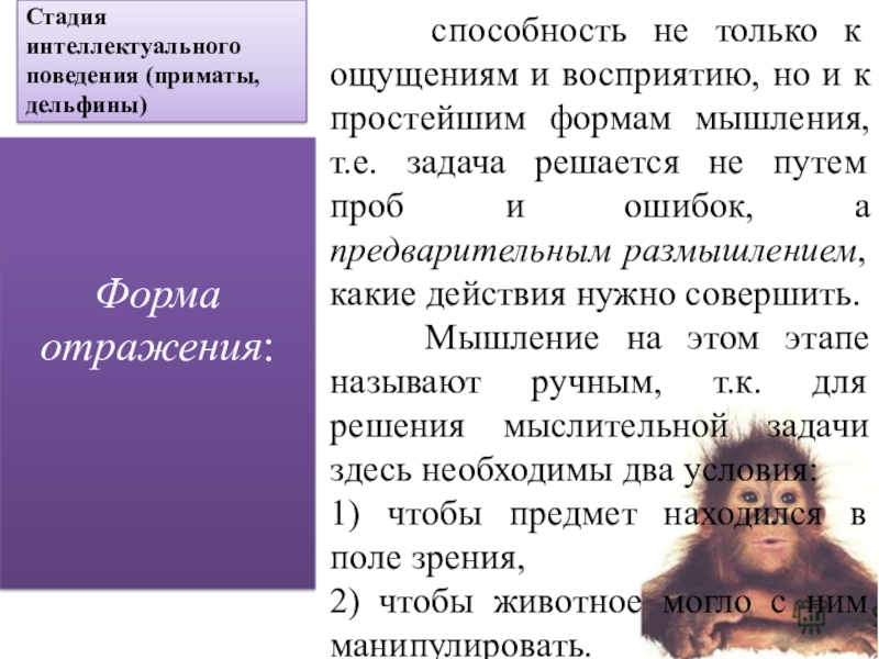 центральная нервная система, отражение отношений между предметами и причинно-следственных связей, орудийная деятельность, быстрое формирование навыков, подготовка к действию, способность переноса опыта в другие условия.
