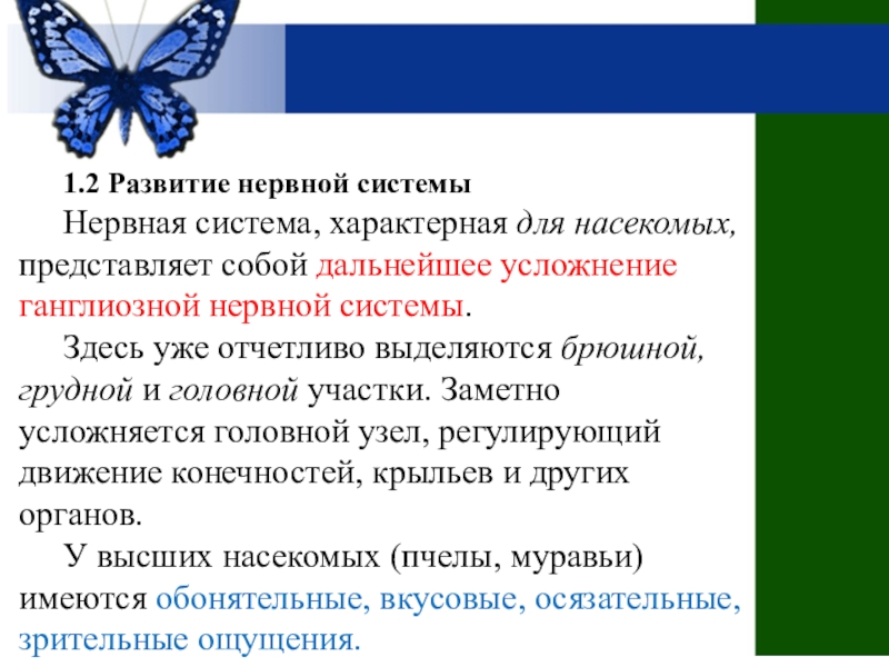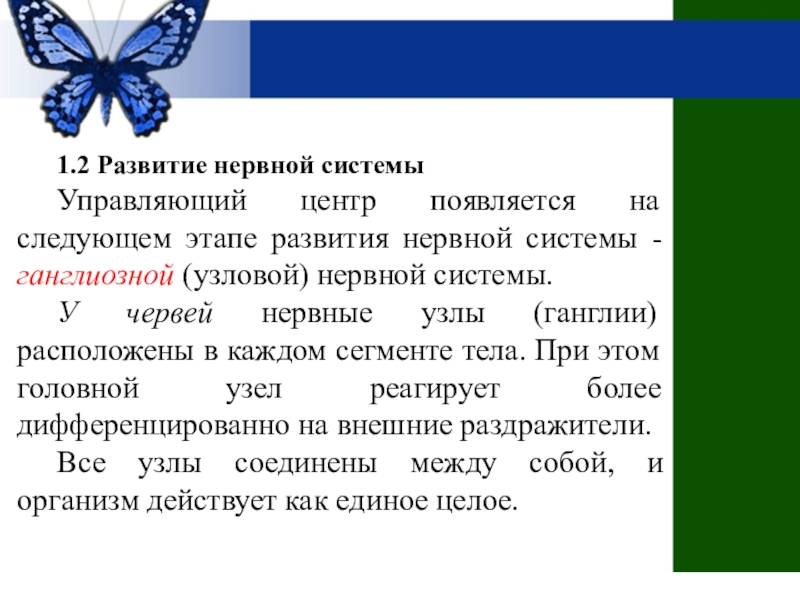 Здесь уже отчетливо выделяются брюшной, грудной и головной участки. Заметно усложняется головной узел, регулирующий движение конечностей, крыльев и других органов.