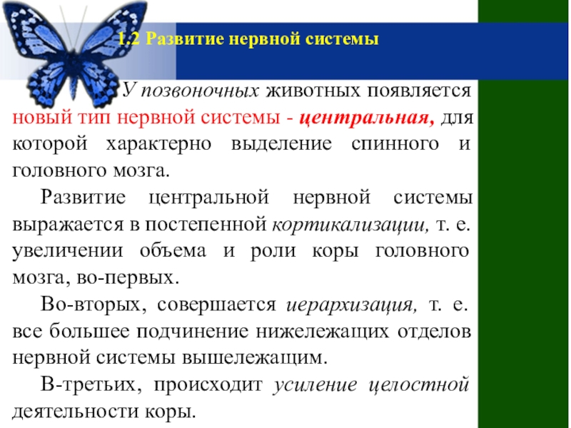 Развитие центральной нервной системы выражается в постепенной кортикализации, т. е. увеличении объема и роли коры головного мозга, во-первых.