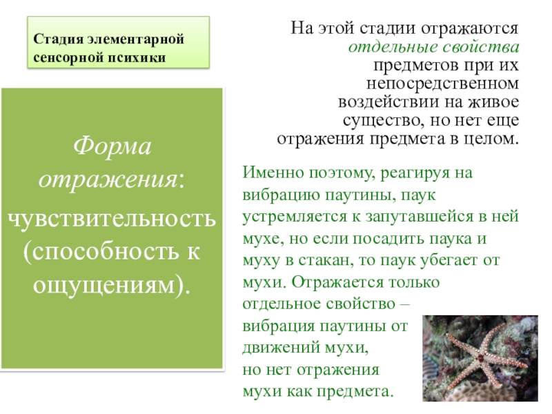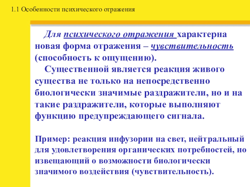 Пример: реакция инфузории на свет, нейтральный для удовлетворения органических потребностей, но извещающий о возможности биологически значимого воздействия (чувствительность).