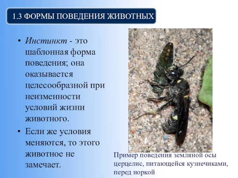 Пример поведения земляной осы церцелис, питающейся кузнечиками, перед норкой