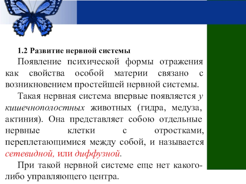 Психическое отражение возникло в результате длительной эволюции материи, на определенном этапе развития живой материи. Оно есть там, где есть зачатки нервной системы, и выступает как свойство, обеспечивающее наилучшее приспособление к среде.