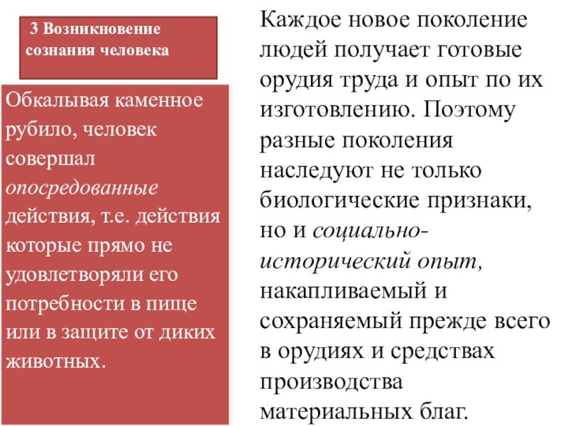 труда и опыт по их изготовлению. Поэтому разные поколения наследуют не только биологические признаки, но и социально-исторический опыт, накапливаемый и сохраняемый прежде всего в орудиях и средствах производства материальных благ.