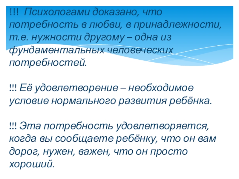 Они питают эмоционально, помогая психологически развиваться. Если же ребёнок их не получает, то появляются эмоциональные проблемы, отклонения в поведении, а то и нервно-психические заболевания.