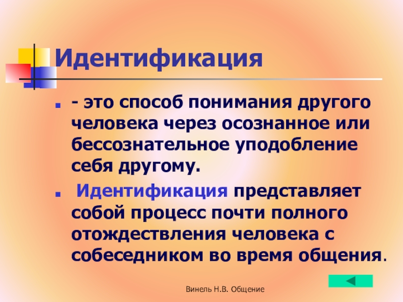 Винель Н.В. ОбщениеИдентификация- это способ понимания другого человека через осознанное или бессознательное уподобление себя другому. Идентификация представляет