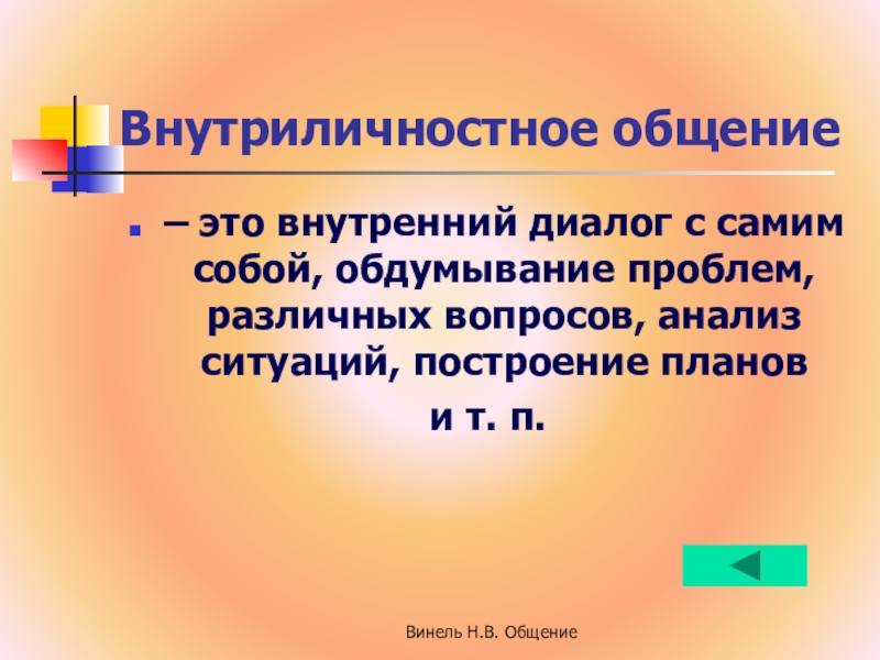 Винель Н.В. ОбщениеВнутриличностное общение– это внутренний диалог с самим собой, обдумывание проблем, различных вопросов, анализ ситуаций, построение
