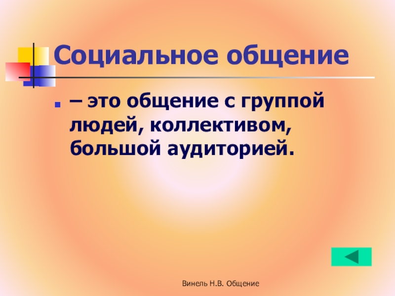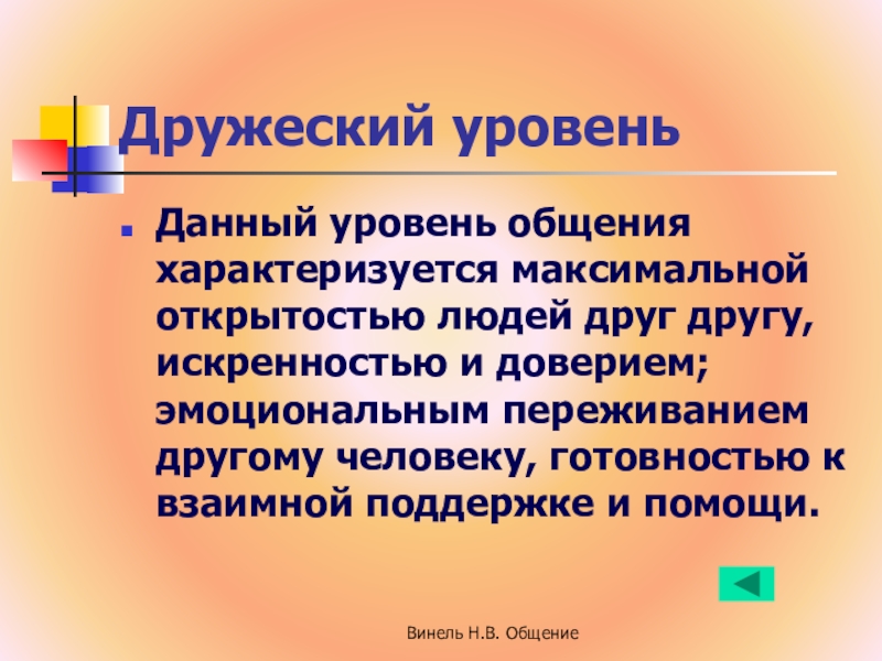 Винель Н.В. ОбщениеДружеский уровеньДанный уровень общения характеризуется максимальной открытостью людей друг другу, искренностью и доверием; эмоциональным переживанием