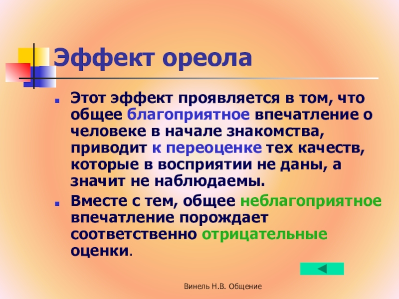 Винель Н.В. ОбщениеЭффект ореолаЭтот эффект проявляется в том, что общее благоприятное впечатление о человеке в начале знакомства,