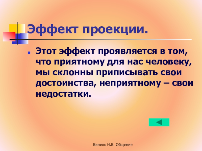 Винель Н.В. ОбщениеЭффект проекции.Этот эффект проявляется в том, что приятному для нас человеку, мы склонны приписывать свои