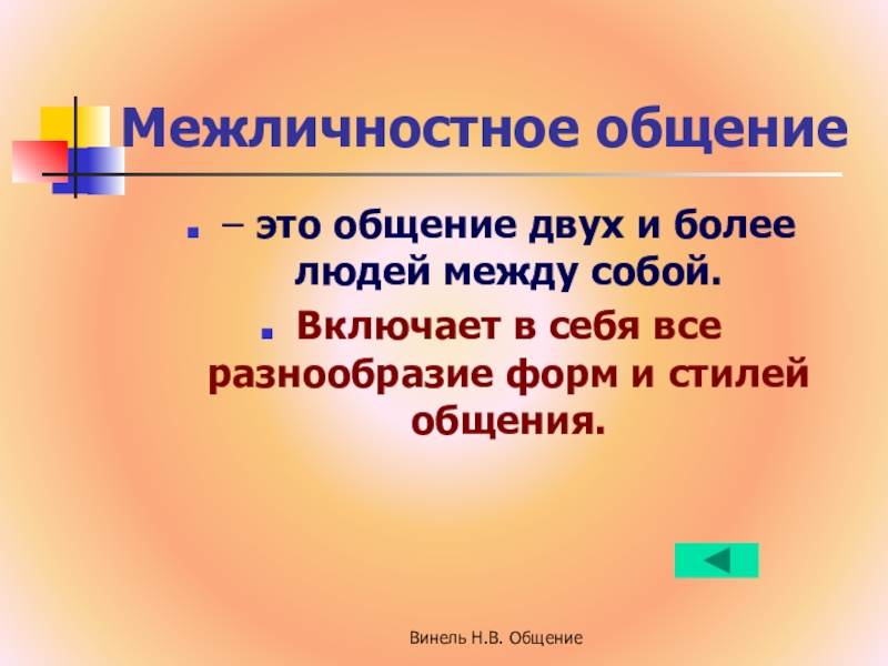 Винель Н.В. ОбщениеМежличностное общение– это общение двух и более людей между собой. Включает в себя все разнообразие