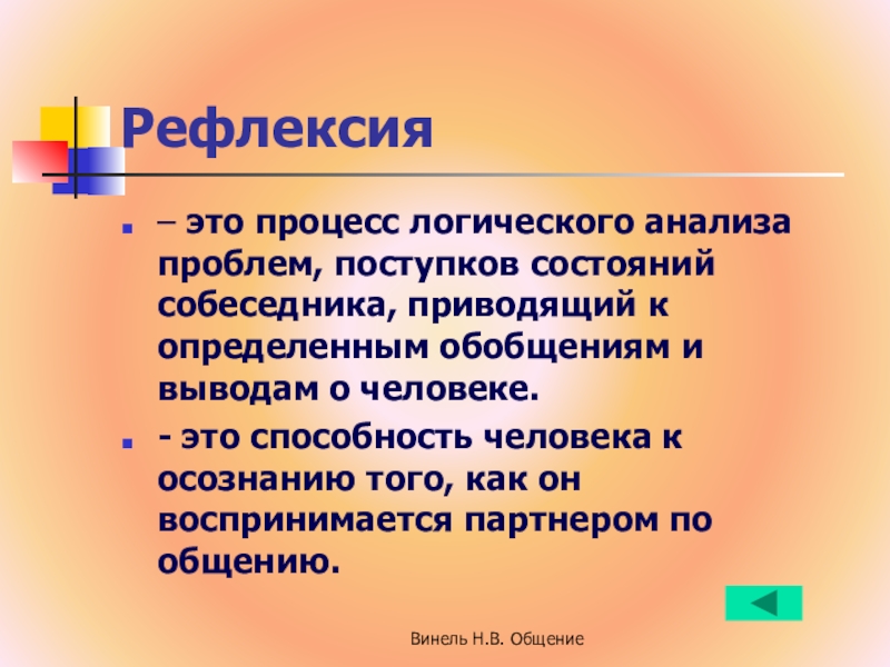 Винель Н.В. ОбщениеРефлексия– это процесс логического анализа проблем, поступков состояний собеседника, приводящий к определенным обобщениям и выводам