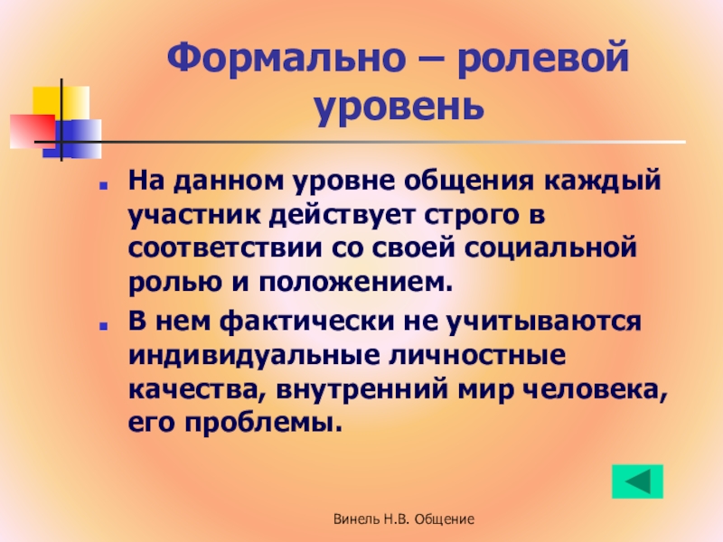 Винель Н.В. ОбщениеФормально – ролевой уровеньНа данном уровне общения каждый участник действует строго в соответствии со своей