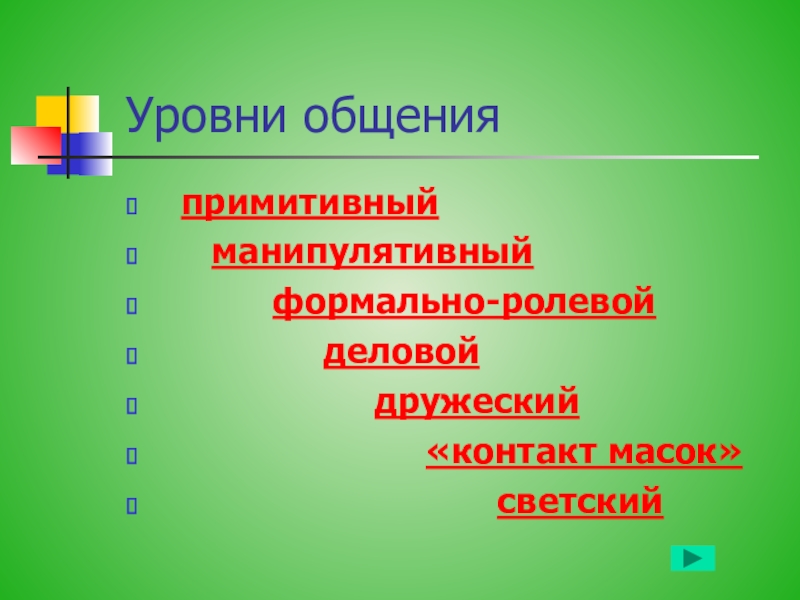 Уровни общенияпримитивный  манипулятивный     формально-ролевой       деловой