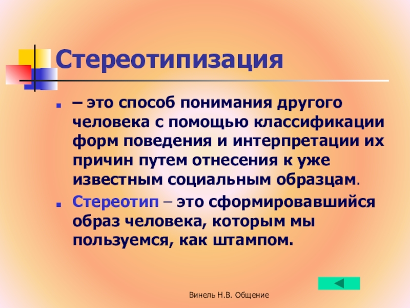 Винель Н.В. ОбщениеСтереотипизация– это способ понимания другого человека с помощью классификации форм поведения и интерпретации их причин