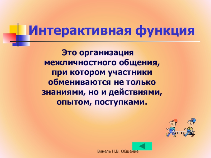 Винель Н.В. ОбщениеИнтерактивная функцияЭто организация межличностного общения, при котором участники обмениваются не только знаниями, но и действиями,