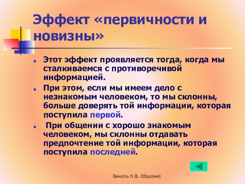 Винель Н.В. ОбщениеЭффект «первичности и новизны»Этот эффект проявляется тогда, когда мы сталкиваемся с противоречивой информацией. При этом,