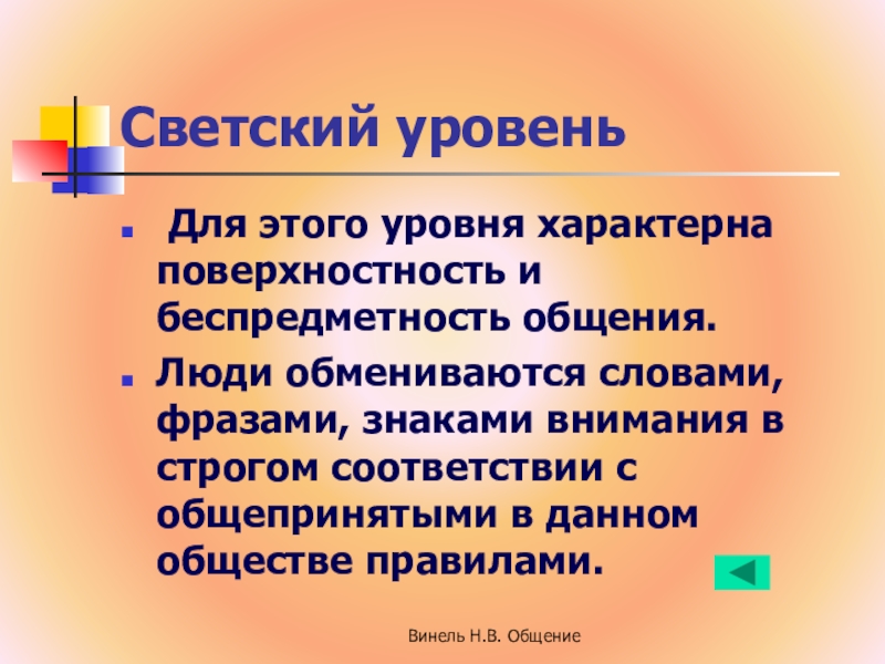 Винель Н.В. ОбщениеСветский уровень Для этого уровня характерна поверхностность и беспредметность общения. Люди обмениваются словами, фразами, знаками