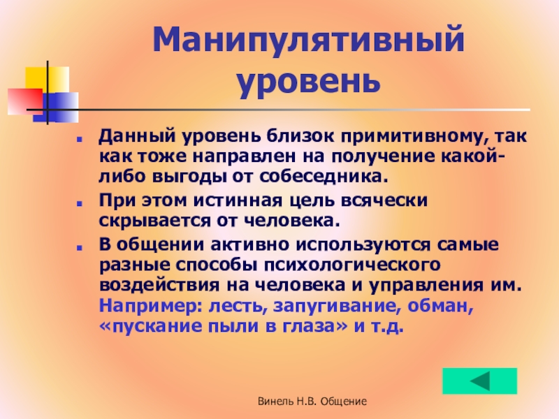 Винель Н.В. ОбщениеМанипулятивный уровеньДанный уровень близок примитивному, так как тоже направлен на получение какой-либо выгоды от собеседника.