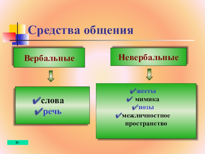 Средства общенияВербальныеслова речьжесты мимикапозымежличностное пространствоНевербальные