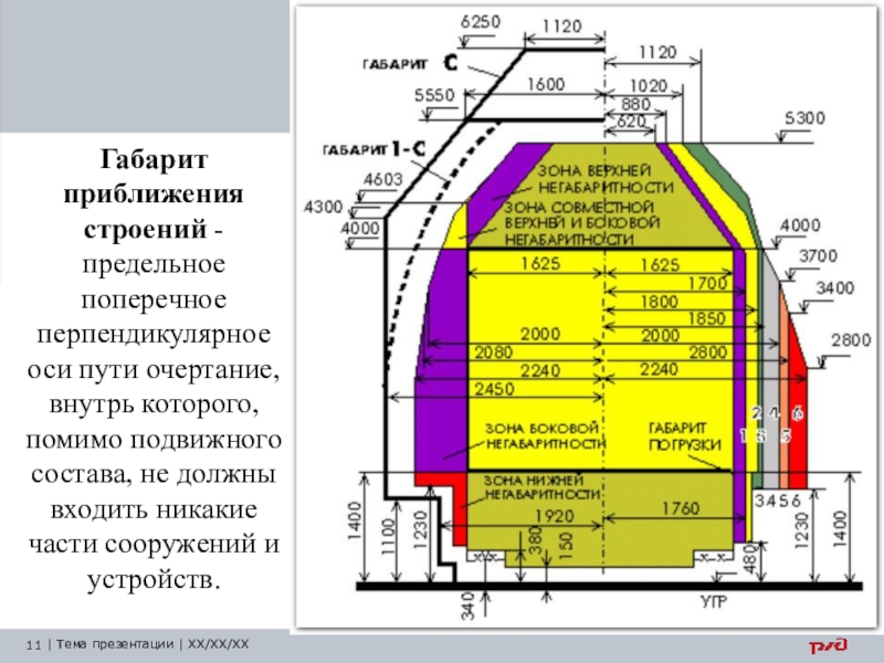 Слайд 11Габарит приближения строений - предельное поперечное перпендикулярное оси пути очертание, внутрь