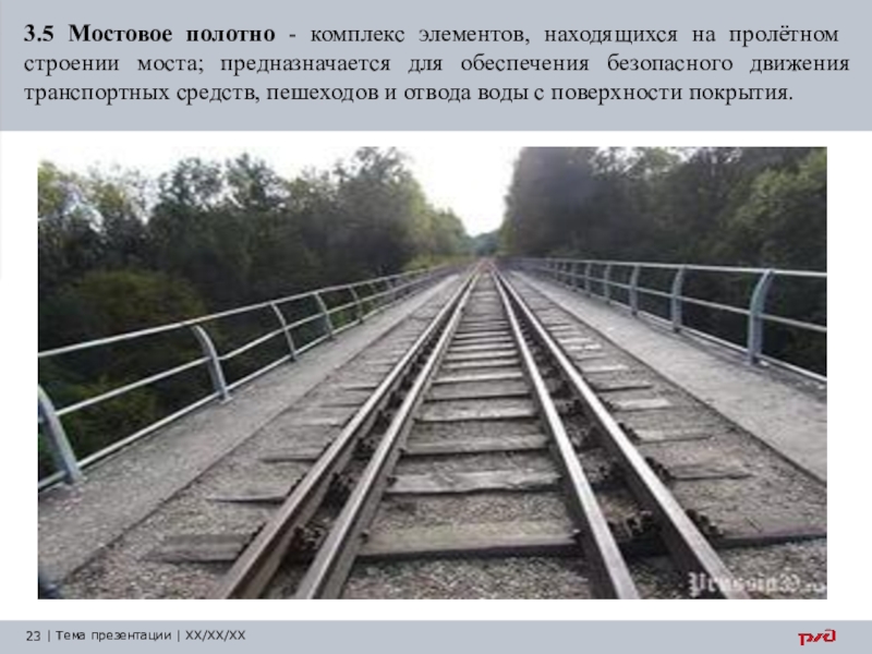 Слайд 233.5 Мостовое полотно - комплекс элементов, находящихся на пролётном строении моста;