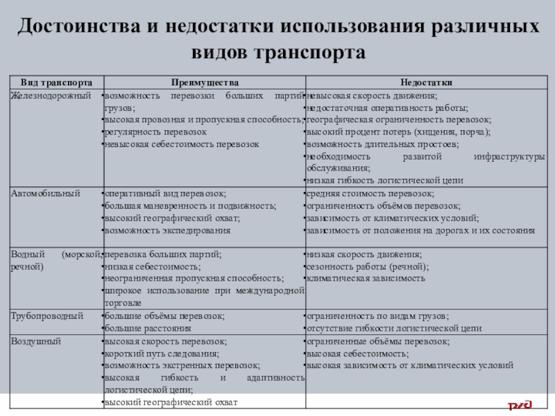 Слайд 3Достоинства и недостатки использования различных видов транспорта