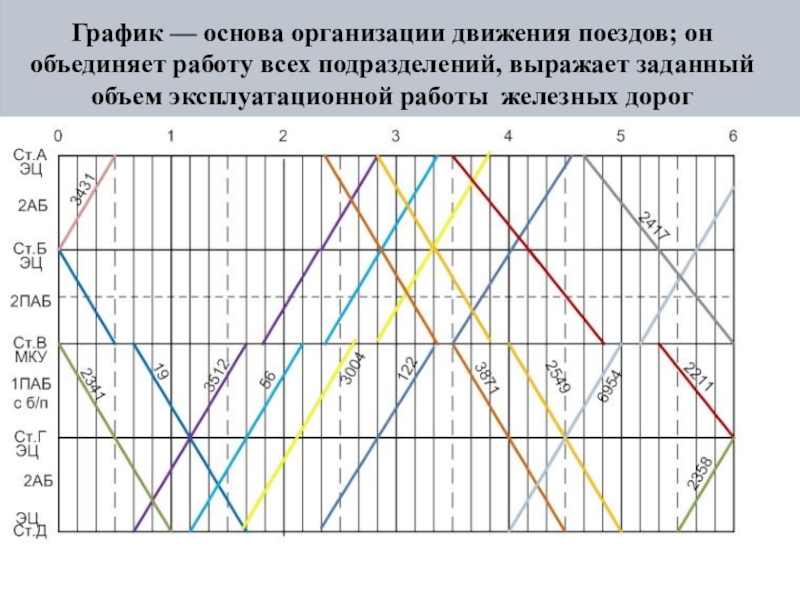 Слайд 33График — основа организации движения поездов; он объединяет работу всех подразделений,