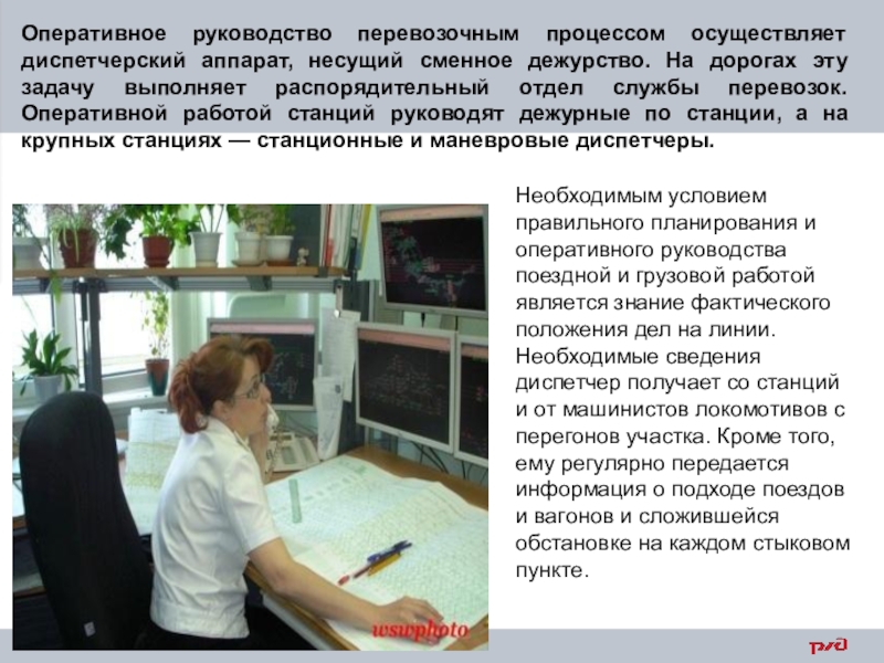 Слайд 34Оперативное руководство перевозочным процессом осуществляет диспетчерский аппарат, несущий сменное дежурство. На