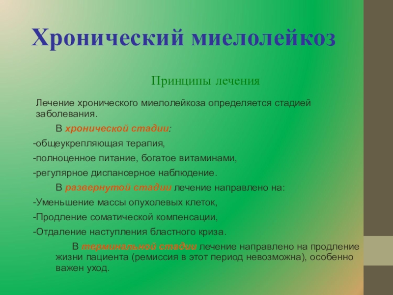 Лечение хронического миелолейкоза определяется стадией заболевания.