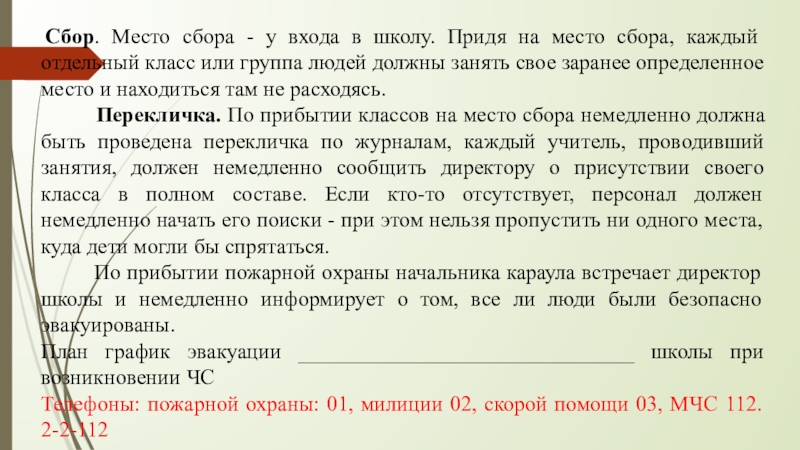 Перекличка. По прибытии классов на место сбора немедленно должна быть проведена перекличка по журналам, каждый учитель, проводивший занятия, должен немедленно сообщить директору о присутствии своего класса в полном составе. Если кто-то отсутствует, персонал должен немедленно начать его поиски - при этом нельзя пропустить ни одного места, куда дети могли бы спрятаться.