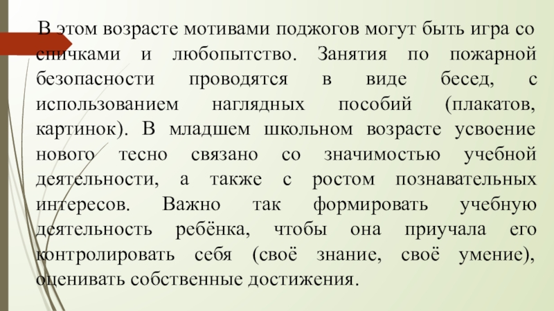 и любопытство. Занятия по пожарной безопасности проводятся в виде бесед, с использованием наглядных пособий (плакатов, картинок). В младшем школьном возрасте усвоение нового тесно связано со значимостью учебной деятельности, а также с ростом познавательных интересов. Важно так формировать учебную деятельность ребёнка, чтобы она приучала его контролировать себя (своё знание, своё умение), оценивать собственные достижения.