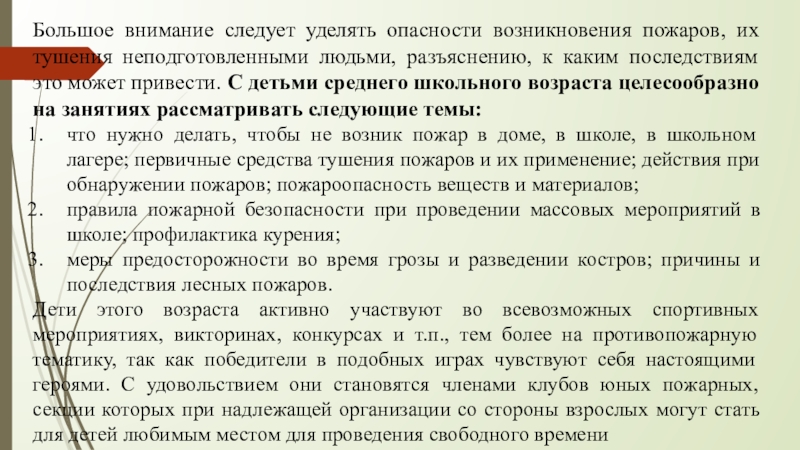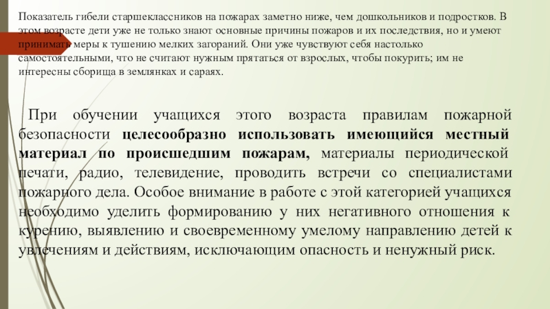 При обучении учащихся этого возраста правилам пожарной безопасности целесообразно использовать имеющийся местный материал по происшедшим пожарам, материалы периодической печати, радио, телевидение, проводить встречи со специалистами пожарного дела. Особое внимание в работе с этой категорией учащихся необходимо уделить формированию у них негативного отношения к курению, выявлению и своевременному умелому направлению детей к увлечениям и действиям, исключающим опасность и ненужный риск.
