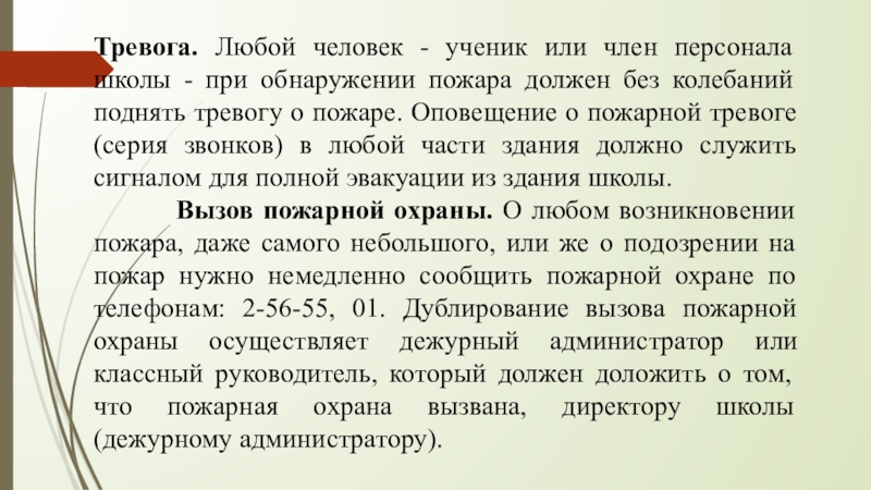 Вызов пожарной охраны. О любом возникновении пожара, даже самого небольшого, или же о подозрении на пожар нужно немедленно сообщить пожарной охране по телефонам: 2-56-55, 01. Дублирование вызова пожарной охраны осуществляет дежурный администратор или классный руководитель, который должен доложить о том, что пожарная охрана вызвана, директору школы (дежурному администратору).