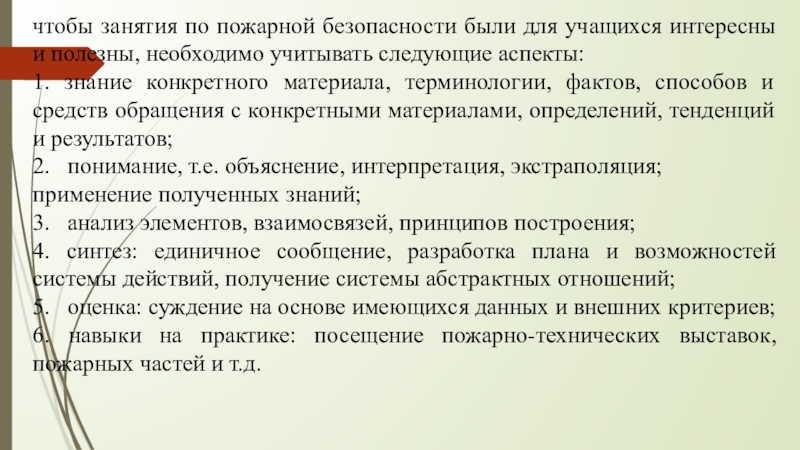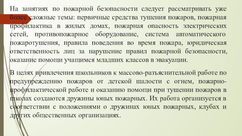 Слайд 14На занятиях по пожарной безопасности следует рассматривать уже более сложные темы: