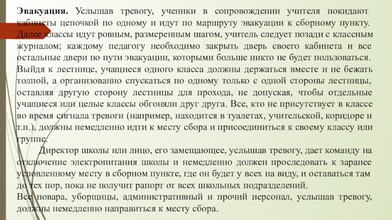 одному и идут по маршруту эвакуации к сборному пункту. Далее классы идут ровным, размеренным шагом, учитель следует позади с классным журналом; каждому педагогу необходимо закрыть дверь своего кабинета и все остальные двери по пути эвакуации, которыми больше никто не будет пользоваться. Выйдя к лестнице, учащиеся одного класса должны держаться вместе и не бежать толпой, а организованно спускаться по одному только с одной стороны лестницы, оставляя другую сторону лестницы для прохода, не допуская, чтобы отдельные учащиеся или целые классы обгоняли друг друга. Все, кто не присутствует в классе во время сигнала тревоги (например, находится в туалетах, учительской, коридоре и т.п.), должны немедленно идти к месту сбора и присоединиться к своему классу или группе.