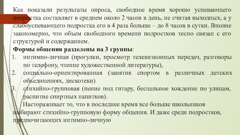 среднем около 2 часов в день, не считая выходных, а у слабоуспевающего подростка его в 4 раза больше – до 8 часов в сутки. Вполне закономерно, что объем свободного времени подростков тесно связан с его структурой и содержанием.
