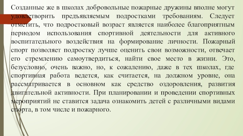 Слайд 10Созданные же в школах добровольные пожарные дружины вполне могут удовлетворить предъявляемым