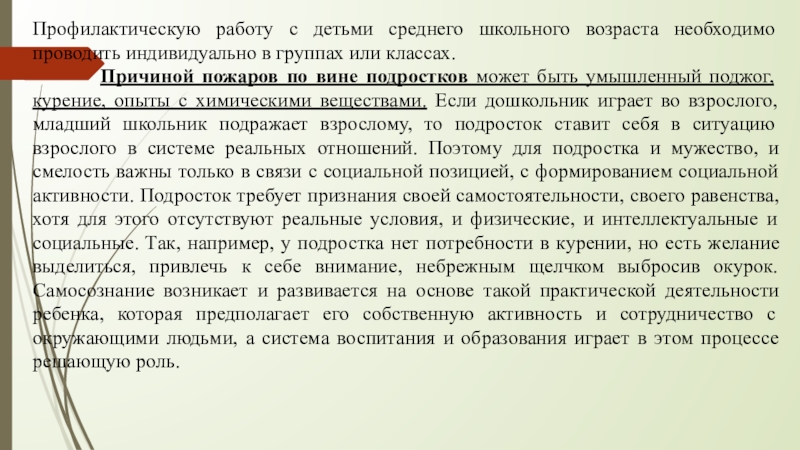 Причиной пожаров по вине подростков может быть умышленный поджог, курение, опыты с химическими веществами. Если дошкольник играет во взрослого, младший школьник подражает взрослому, то подросток ставит себя в ситуацию взрослого в системе реальных отношений. Поэтому для подростка и мужество, и смелость важны только в связи с социальной позицией, с формированием социальной активности. Подросток требует признания своей самостоятельности, своего равенства, хотя для этого отсутствуют реальные условия, и физические, и интеллектуальные и социальные. Так, например, у подростка нет потребности в курении, но есть желание выделиться, привлечь к себе внимание, небрежным щелчком выбросив окурок. Самосознание возникает и развивается на основе такой практической деятельности ребенка, которая предполагает его собственную активность и сотрудничество с окружающими людьми, а система воспитания и образования играет в этом процессе решающую роль.