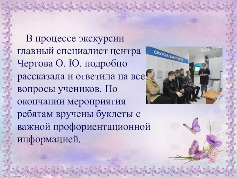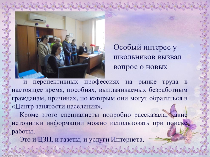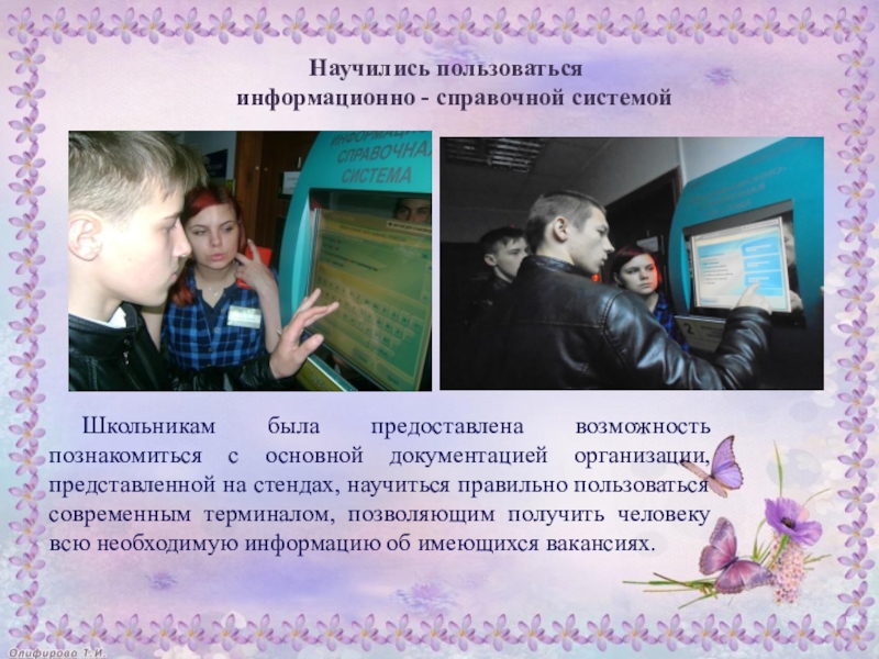 Школьникам была предоставлена возможность познакомиться с основной документацией организации, представленной на стендах, научиться правильно пользоваться современным терминалом, позволяющим получить человеку всю необходимую информацию об имеющихся вакансиях.