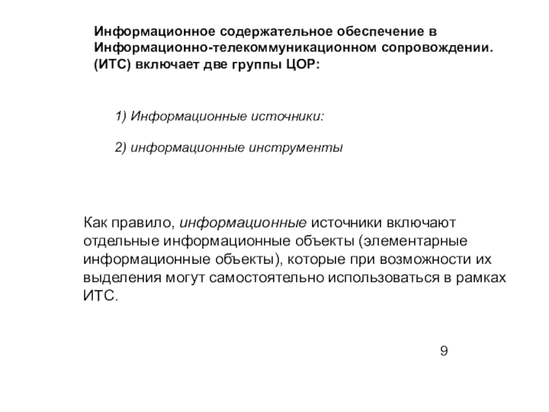 Как правило, информационные источники включают отдельные информационные объекты (элементарные информационные объекты), которые при возможности их выделения могут самостоятельно использоваться в рамках ИТС.