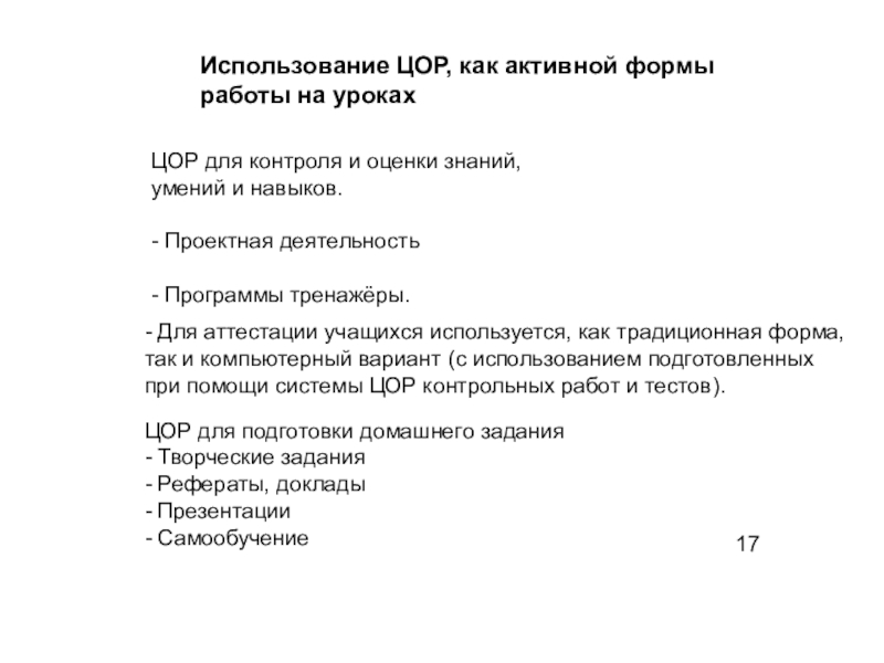 - Для аттестации учащихся используется, как традиционная форма, так и компьютерный вариант (с использованием подготовленных при помощи системы ЦОР контрольных работ и тестов).