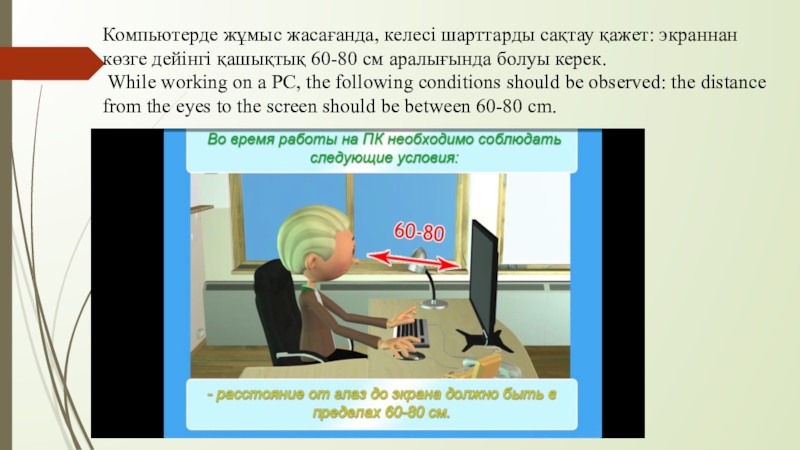 Компьютерде жұмыс жасағанда, келесі шарттарды сақтау қажет: экраннан көзге дейінгі қашықтық 60-80 см аралығында болуы керек. While