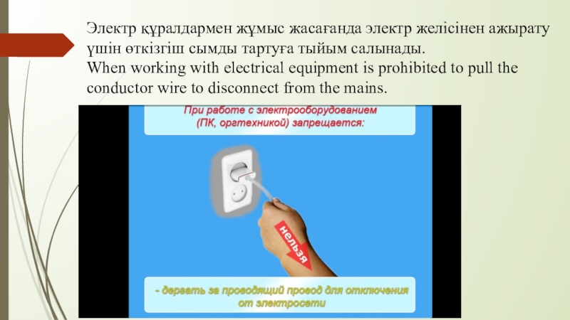 Электр құралдармен жұмыс жасағанда электр желісінен ажырату үшін өткізгіш сымды тартуға тыйым салынады.When working with electrical equipment is prohibited to pull the conductor wire to disconnect from the mains.