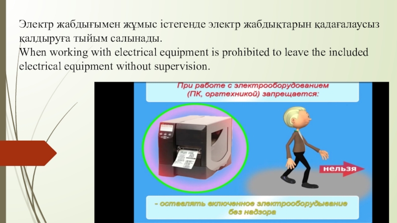 Слайд 3Электр жабдығымен жұмыс істегенде электр жабдықтарын қадағалаусыз қалдыруға тыйым салынады.